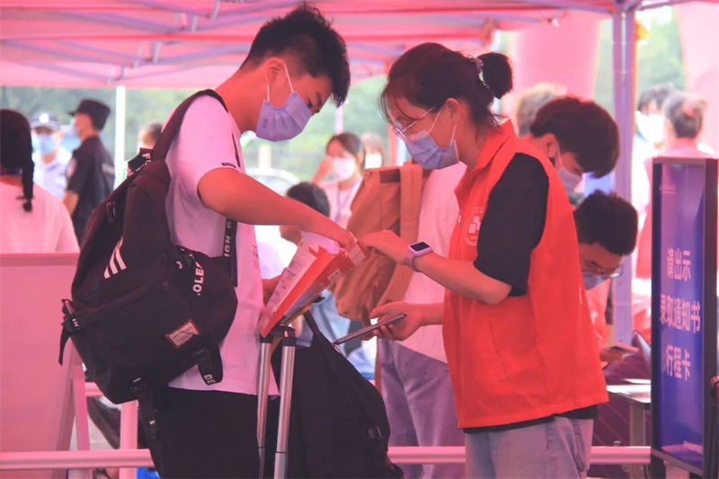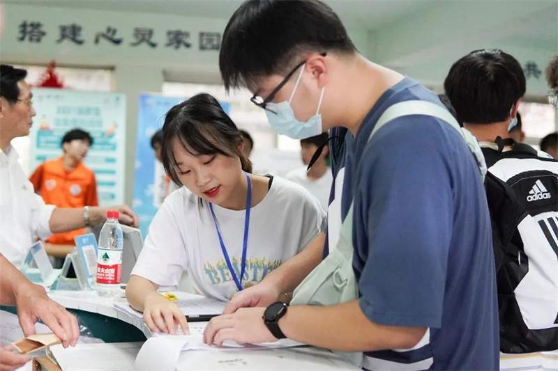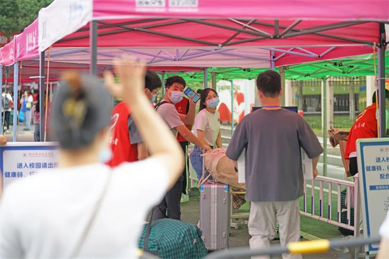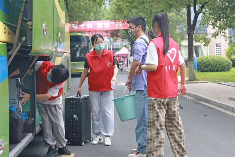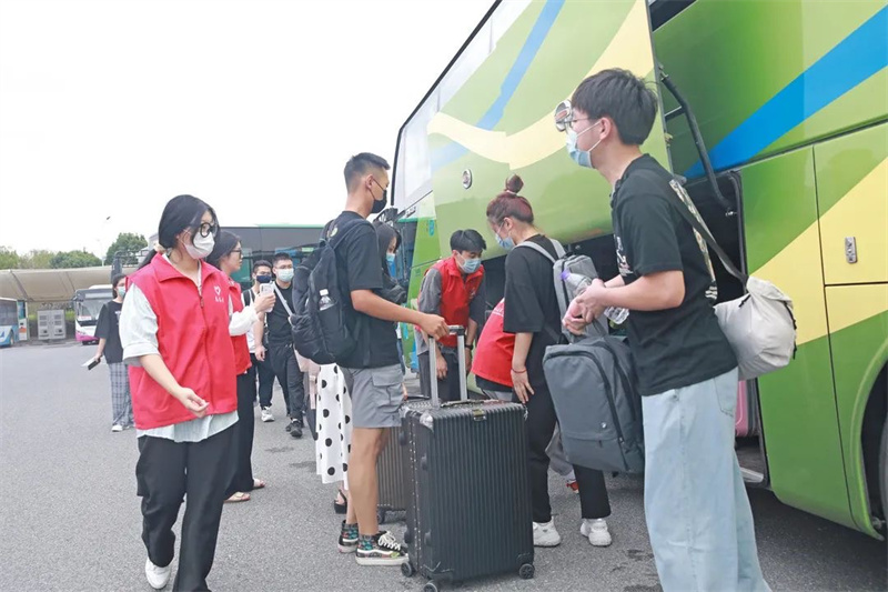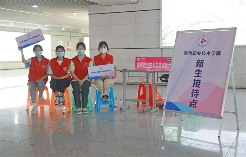 早上7点,湖州高铁站、长途汽车总站以及绿色车站等主要校外接驳站点和校园东南门入校通道、双码查验、行李搬运服务、学生宿舍等各环节,工作人员全部准备就绪。他们穿着戴有湖州职业技术学院LOGO的统一服装,手里拿着引导牌,各司其职,默契配合,用灿烂的笑脸、热情的问候、周到的服务,给新生留下美好湖职的第一印象。