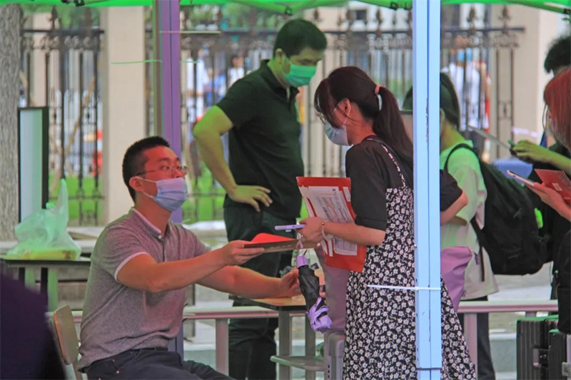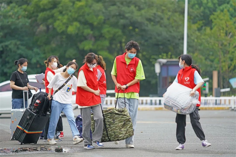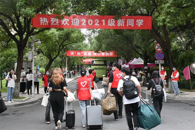 在各流程服务点,迎新工作人员和志愿者们按照学校疫情防控工作部署,有序指导新生出示健康码和行程码、测量体温。不时有热情洋溢的“红马甲”志愿者接过新同学和父母手中的行李,帮助他们搬运进校园。学校专门在校门口设立了多趟接驳大巴,往返于校门口和各大寝室楼之间,解决新同学们因携带大件行李而不便行走的“最后一公里”问题。