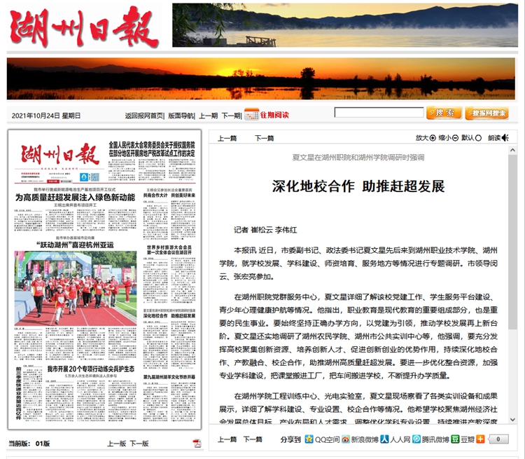 【湖州日报】【湖州新闻综合频道】【南太湖号】夏文星在湖州职院和湖州学院调研时强调:深化地校合作 助推赶超发展