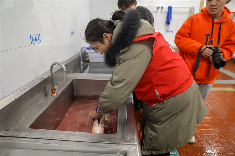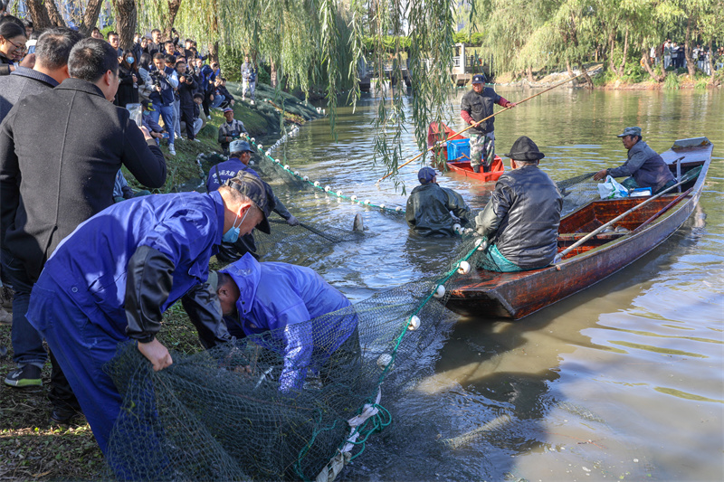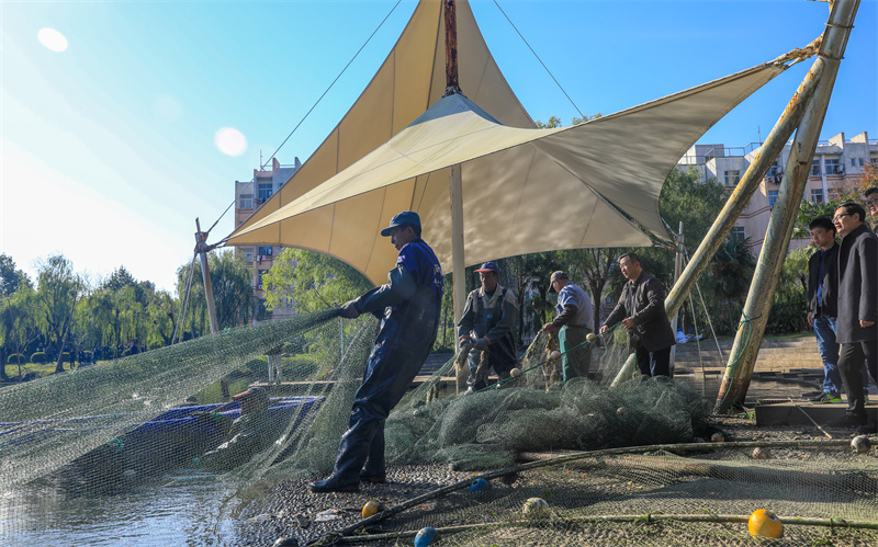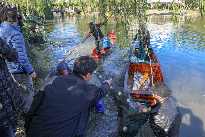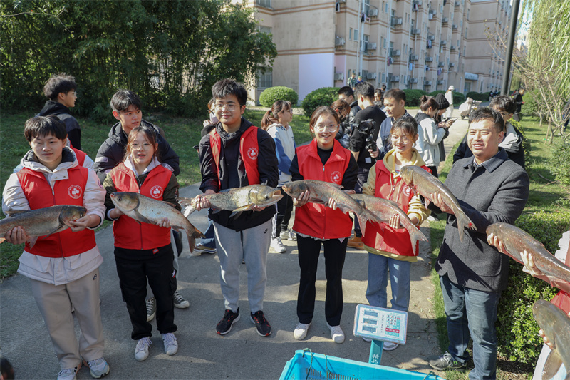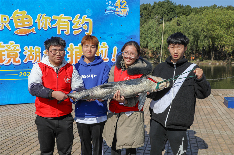 活动仪式后,工作人员和师生齐上阵,一条条肥硕的大鱼不断地被捕捞上岸,镜湖周边到处洋溢着欢声笑语,师生们分享着捕鱼中收获的快乐,捕鱼活动上成了一堂生动活泼的思想政治和劳动教育课。镜湖开捕上来的鱼,学校将免费为师生加餐,一起为学校庆生。