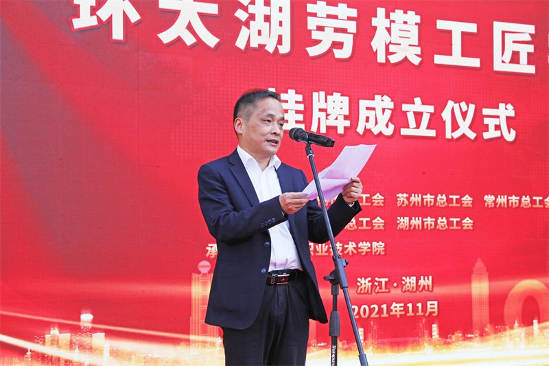 11月12日下午,“环太湖劳模工匠学院”挂牌成立仪式在学校尚能大楼湖州公共实训中心举行,苏州、无锡、常州和嘉兴分会场通过视频连线方式同步参会。湖州市总工会党组书记、副主席朱剑梁,湖州市人力资源和社会保障局党组成员、副局长史淦宝,湖州市总工会副主席徐俊丽和学校副校长陆勤丰、相关职能部门及二级学院负责人、机电与汽车工程学院工匠班全体学生参加挂牌成立仪式。仪式由湖州市总工会副主席徐俊丽主持。