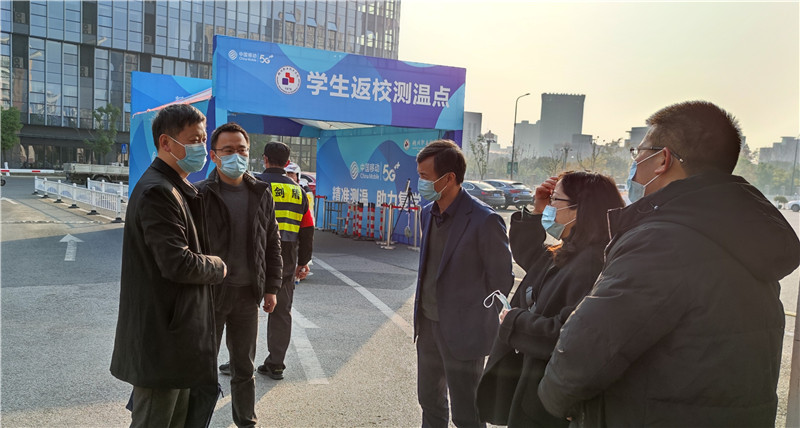检查组先后走访了校园大门、日常健康监测点、食堂、防疫物资存放点等疫情防控重点区域和场所,和相关负责人、工作人员作了深入交流。检查组全面细致了解了校园大门进出管控的要求、遇黄码红码的应急处置措施,日常健康监测点的工作规范、遇临时发热人员的应急处置流程,食堂食品卫生安全和防疫物资保障等情况,针对防疫工作中存在的问题提出了具体、明确的指导意见和建议。
