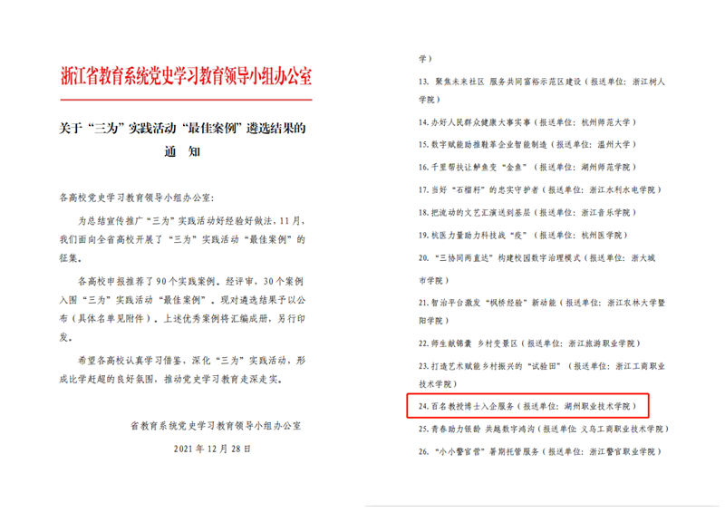 近日,我校报送的《百名教授博士入企服务》案例入选浙江省教育系统党史学习教育领导小组办公室开展征集的“三为”实践活动“最佳案例”。