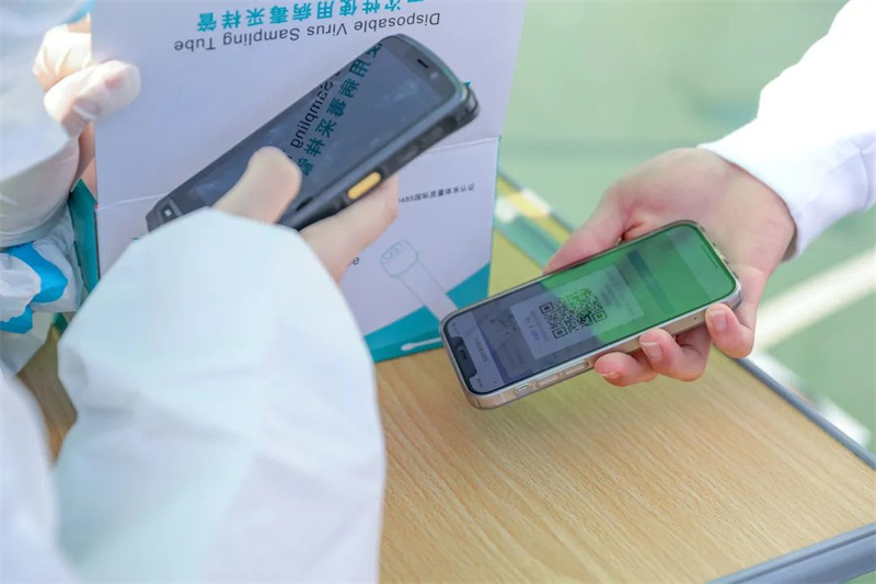 师生员工提前通过扫描核酸检测预约码做好个人信息注册登记,并在现场严格按照一米线距离有序排队等候。佩戴口罩进入信息登记区后,师生凭借个人核酸检测预约码,现场快速出示并确认身份,大大提升了检测效率。