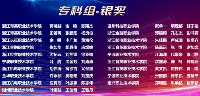 4月16日,由物流与信息工程学院项中华、蔡崇超、蔡承天、万杰等教师指导,由叶翊航、王佳奇、王雅丹等同学组成的湖州职业技术学院代表队沉着应战,在浙江省第十九届大学生程序设计专科组竞赛中喜获银牌。