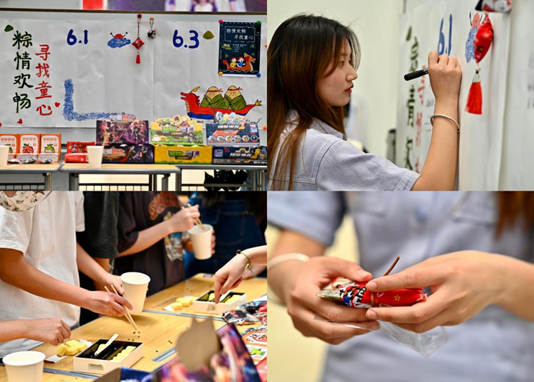 本次活动以追寻儿时的端午记忆和端午传统习俗为主题展开。活动的第一个环节是端午游园会,同学们通过积极参与猜儿歌答题、夹绿豆等小游戏,赢得品尝绿豆糕的机会,并听现场的同学们讲述端午节的来由与习俗。第二个环节——“香囊制作”活动更是将现场的气氛推向了高潮,大家纷纷拿起事先准备好的材料,互相探索、学习如何制作香囊,制作过程中大家专心致志,虽然做的并不是那么精美,但是看着自己亲手做出的香囊大家心里都很是欣喜,活动现场洋溢着满满的节日氛围。活动的最后一个环节是手写送祝福,同学们纷纷在留言板上写下自己对于端午节的心愿与祝福,也为本次活动画上圆满的句号。