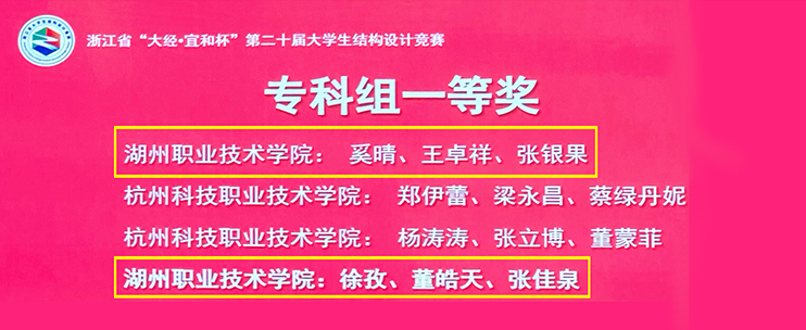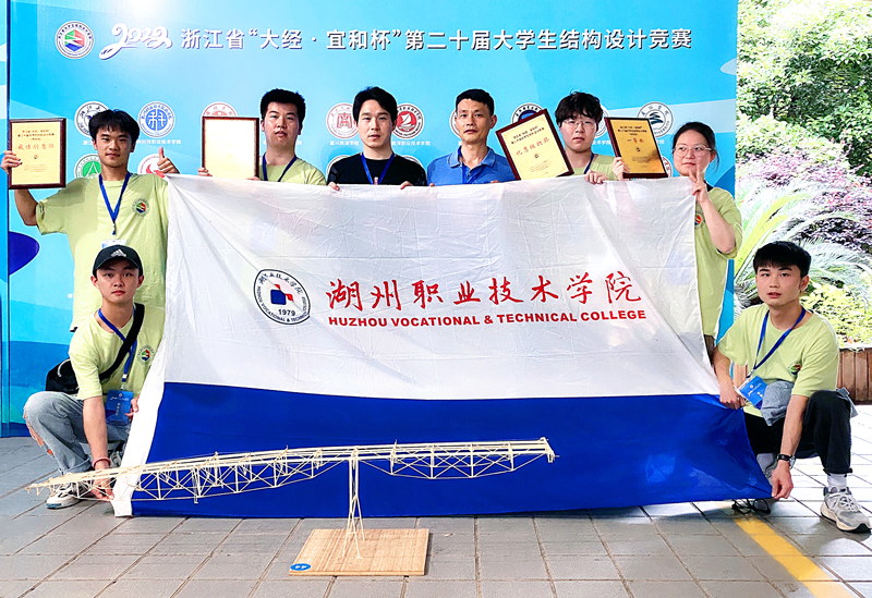 6月5日,浙江省第二十届大学生结构设计竞赛在杭州科技职业技术学院落下帷幕,经过紧张的角逐和评选,我校由奚晴、王卓祥、张银果三位同学组成的“独木桥”代表队,以及由徐孜、董皓天、张佳泉组成的“三只小白”代表队分别以专科组第一名和第四名的成绩双双斩获一等奖。与此同时,我校在本次大赛中获得优秀组织奖,“独木桥”代表队还获得了最佳创意奖。这是我校在浙江省大学生结构设计竞赛中连续9届获得一等奖及以上荣誉。