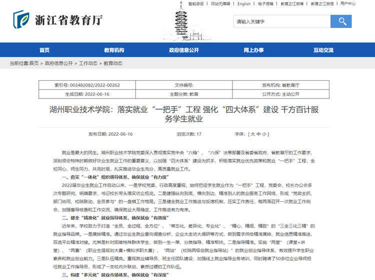 2022年6月16日,浙江省教育厅官网报道了我校多举措推进毕业生高质量就业的相关新闻