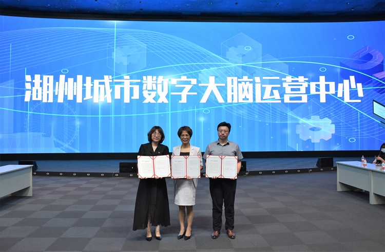 政校企三方相关党组织负责人共同签订了“数智”党建联盟契约,三方将进一步发挥各自优势,强化党建工作引领,合作推动组织建设、重点项目、联盟例会、人才培养、资源共享等各项工作。在党建联盟成员单位第一次座谈会上,与会人员围绕“数字化改革”“人才培养助力社会发展”等主题交流研讨。与会人员还在讲解员的带领下参观了智慧湖州城市大脑运营中心,学习了解其作为湖州“新名片”助推湖州数字化转型形成的先发优势。