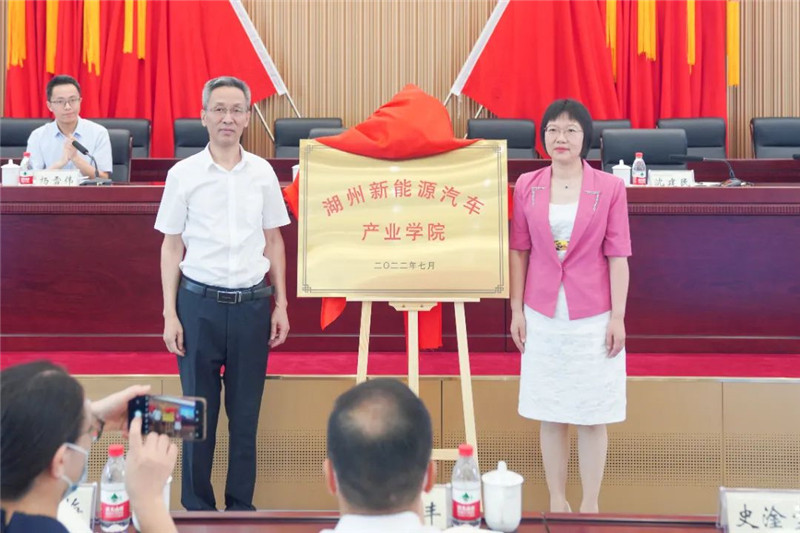 吴登芬与沈建民共同为湖州新能源汽车产业学院揭牌。湖州新能源汽车产业学院由湖州职业技术学院和湖州市人力资源和社会保障局共同发起创建,联合湖州工程技师学院、湖州交通技师学院和湖州市雷博职业技能培训学校,依托湖州新能源汽车及关键零部件产业,开展新能源汽车产业高技能人才培养、实习与就业,新能源产业教学资源开发、实训基地共建,新能源汽车产业工人素质提升,职业院校双师素质提升等。学校将湖州新能源汽车产业学院打造成人才培养、教师发展、实习实训实践、创新创业等有机整合,促进产教融合、科教融合,集产学研一体的人才培养平台,建强优势特色专业,完善人才培养协同机制,培养大批产业需要的高素质应用型、复合型、创新型人才。