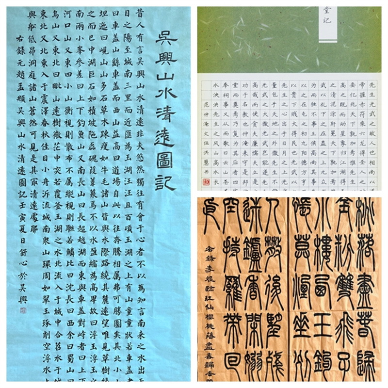 其中,在高校软笔组,徐雨�魍�学创作的《苏轼短文三则》获一等奖;曾铤明同学创作的《临江仙·樱桃落尽春归去》、陈群瑶同学创作的《毛泽东诗词二首》、舒心同学创作的《吴兴山水清远图记》获二等奖;徐佳��同学创作的《正气歌》获三等奖。在高校硬笔组,沈姝�[同学创作的《韩愈短文二则》、刘霆玉同学创作的《道德经节选》获二等奖;黄鑫烨同学创作的《书洛阳名园记后》、胡琳双同学创作的《史记酷吏列传序》、伍洪慧同学创作的《严先生祠堂记》获三等奖。