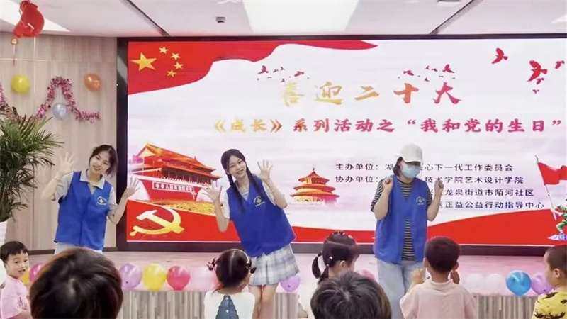 为让红色基因、革命薪火代代传承,引领童心向党、健康成长,艺术设计学院团委联合湖州市关工委开展“喜迎二十大——《成长》系列之‘我和党的生日’”主题活动。在志愿者的示范教学下,孩子们认读了“党”字,做出一个个漂亮的红色剪纸,并成功串上了中国结,表达了对“党的生日”的美好祝福。孩子们通过“重走长征路”等游戏环节,感受红军长征的艰难险阻,珍惜今天幸福生活的来之不易。建筑工程学院团委带领“阳光队”的队员们向善琏镇平乐村的孩子们介绍了中国共产党百年来经历的风雨以及典型模范人物,引导孩子们结合自身向典型看齐,向模范学习。在宏建村,队员们还教小朋友们参与各种手工制作,鼓励学生动手、动脑,养成团队合作意识,以培养他们爱国精神、动脑能力和创新精神。