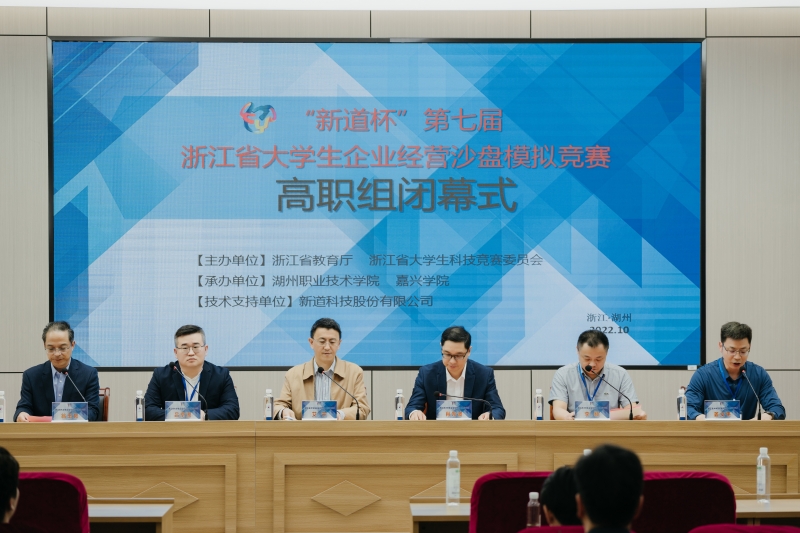10月23日上午,“新道杯”第七届浙江省大学生企业经营沙盘模拟竞赛(高职组)闭幕式在我校举行。闭幕式通过公众号网络直播的形式面向全体参赛院校师生召开。湖州职业技术学院副校长肖先波、嘉兴学院教务处处长艾宁、嘉兴学院商学院院长李郁明、浙江财经大学东方学院院长李毅等领导和嘉宾出席闭幕式。
