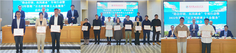 10月20日下午,学校在教师发展中心召开“助企纾困、拓岗就业”专项行动暨2022年暑期“百名教授博士入企服务”活动总结表彰大会。校长沈建民、党委副书记叶主、副校长肖先波、副校长左希庆,科技与服务地方处、人事处、教务处、学生处、招生就业处、团委等部门有关负责人,各二级教学单位负责人,二级学院党总支书记,教师入企团队负责人代表,学生实习、实践团队代表等50余人参加会议。副校长肖先波主持会议。