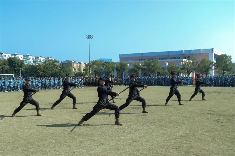 我校退役学生自治组织戎耀卫队的队员们在动员大会上作了军事技能表演,赢得参会师生的阵阵掌声。