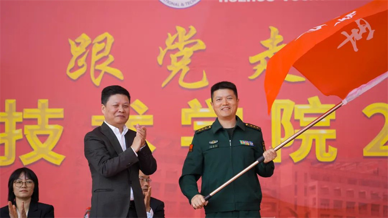 校党委书记周家健向承训部队授旗,并宣布2022级新生军训开训。