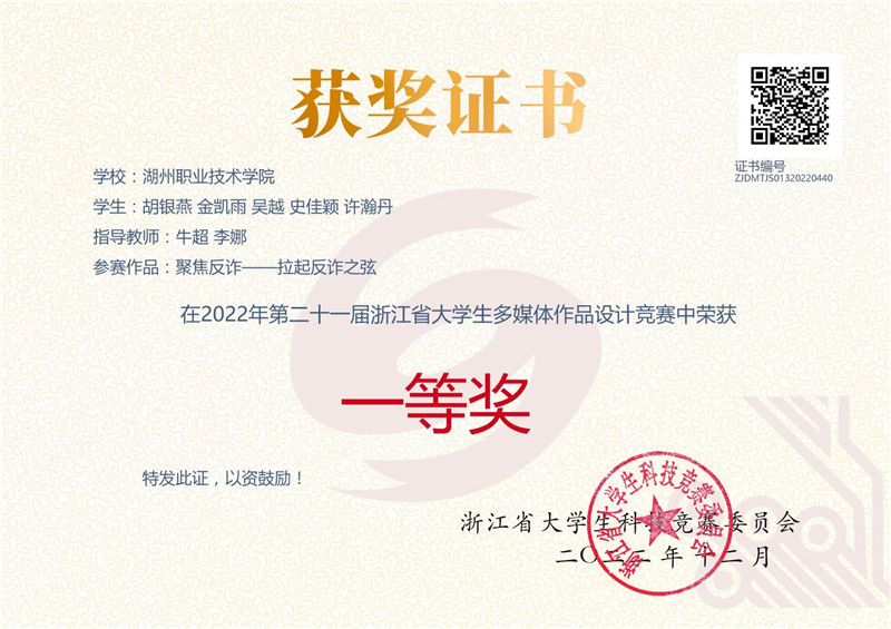 浙江省大学生多媒体作品设计竞赛是由浙江省教育厅、浙江省公安厅联合指导,由浙江省大学生科技竞赛委员会主办的省级一类竞赛,本届大赛以“反诈骗”为竞赛主题,旨在进一步推动落实校园安全意识,让大学在开展作品创意制作的同时增强反诈骗意识,让大学生走出象牙塔,走进社会、服务社会,锻炼大学生的创新意识与服务意识。大赛共收到参赛作品1303件,经初赛专家评审后,共有368件作品入围答辩。