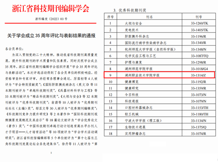 近日,根据浙江省科技期刊编辑学会公布的《关于学会成立35周年评比与表彰结果的通报》(浙科编发〔2022〕03号),我校喜获集体和个人多个奖项。