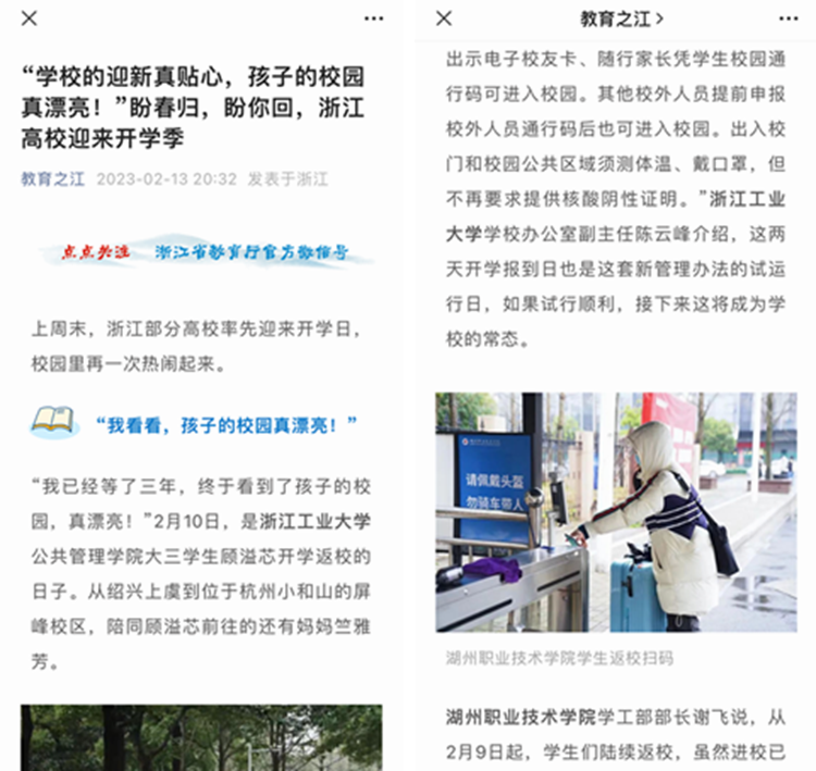2023年2月13日“教育之江”报道了新学期学生返校的相关新闻