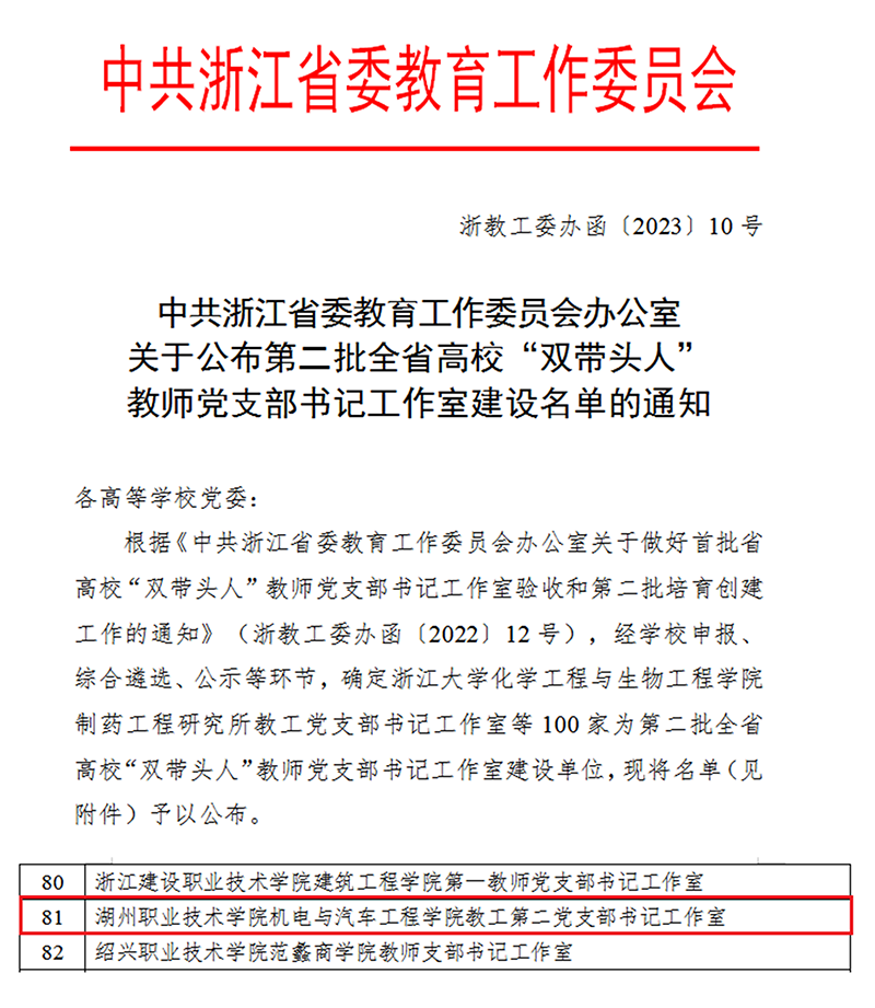 近日,浙江省教育厅公布第二批高校“双带头人”教师党支部书记工作室评审结果,我校智能制造与电梯学院(原机电与汽车工程学院)教工第二党支部书记工作室成功入选。