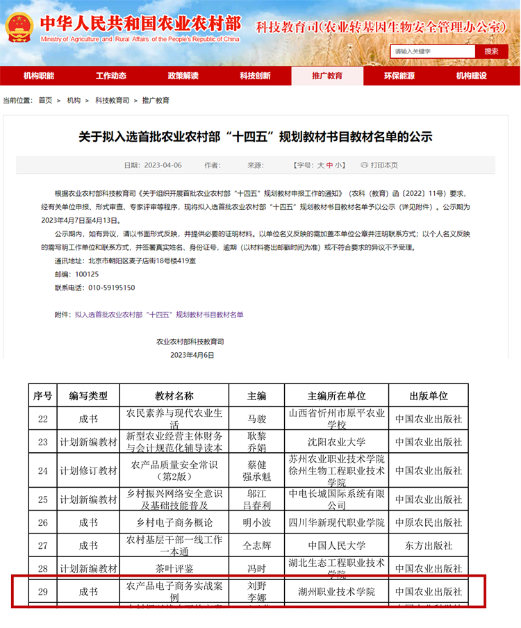 近日,农业农村部科技教育司发文公布了首批农业农村部“十四五”规划教材书目教材名单。经组织专家遴选,我校经济管理与电商学院刘野、李娜老师主编的《农产品电子商务实战案例》教材入选首批农业农村部“十四五”规划教材。