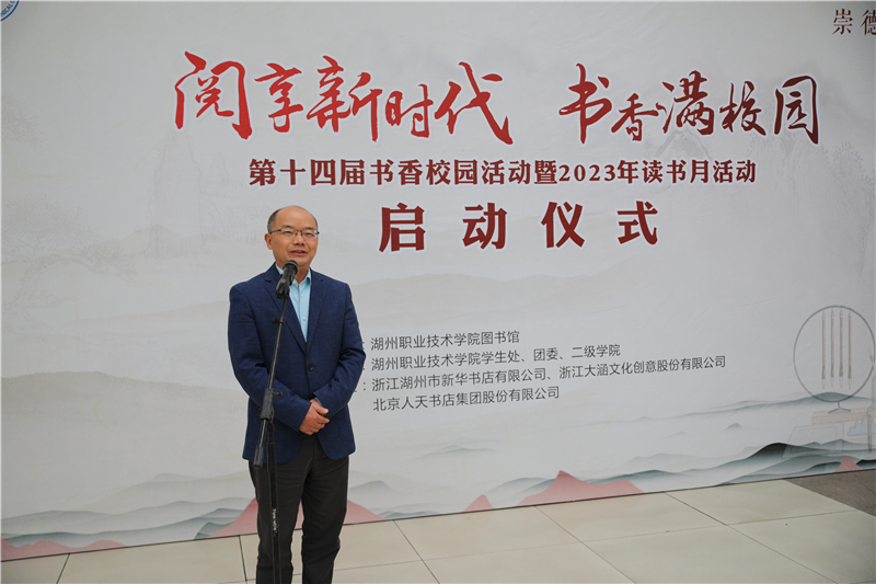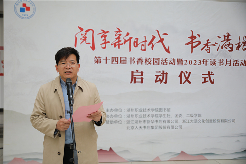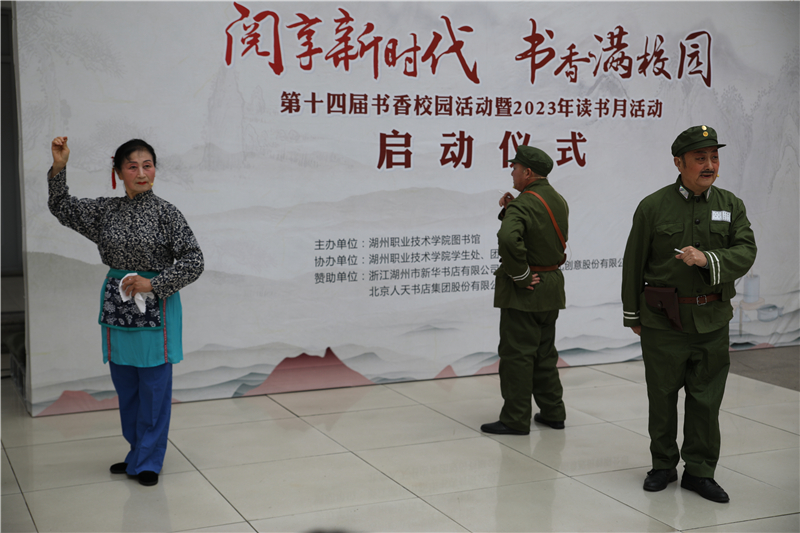 为贯彻落实党的二十大关于深化全民阅读活动的重要部署,积极响应教育部等八部门印发的《关于全国青少年学生读书行动实施方案》的通知精神,深入开展“书香校园建设”,4月23日下午,学校第十四届书香校园活动暨2023年读书月活动在学校正式启动。校党委副书记叶主,校党委委员、副校长左希庆,图书馆、学工部、团委负责人,各二级学院党总支副书记、湖韵师生朗诵社指导教师以及师生代表、湖州留香京剧票友社票友等200余人参加启动仪式。