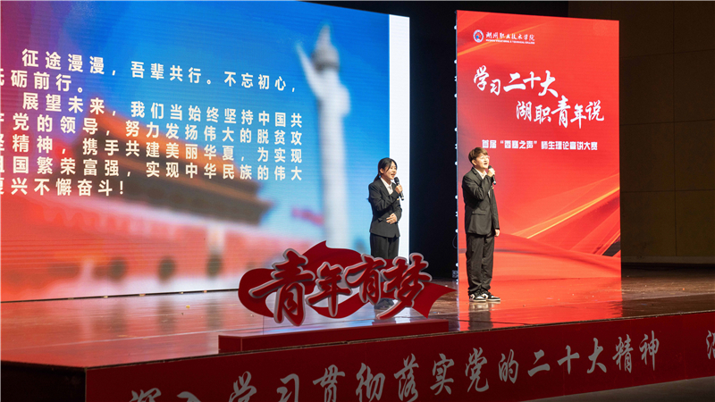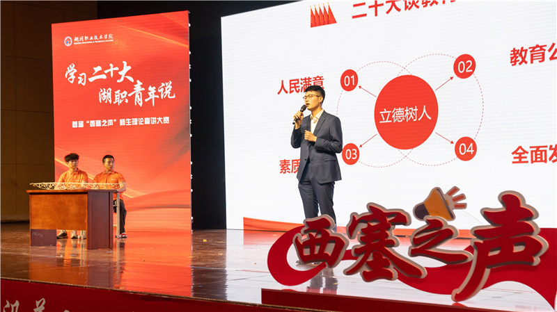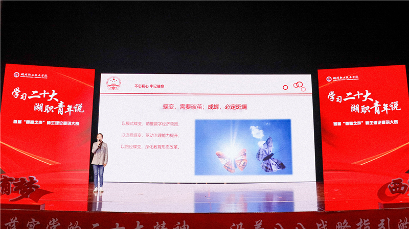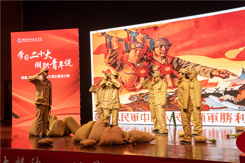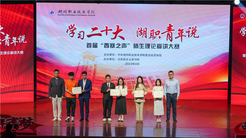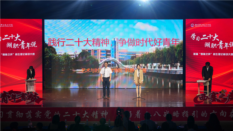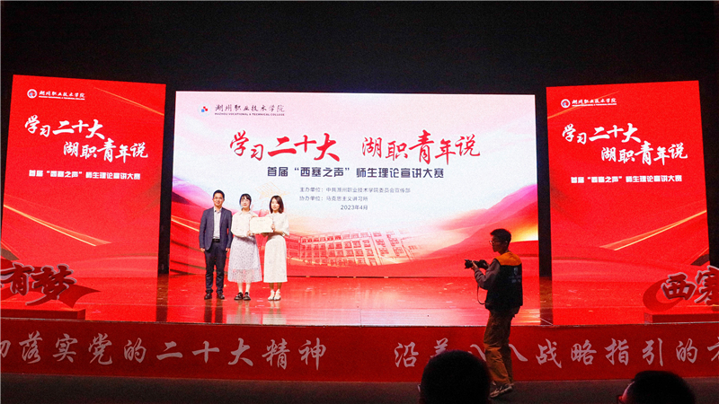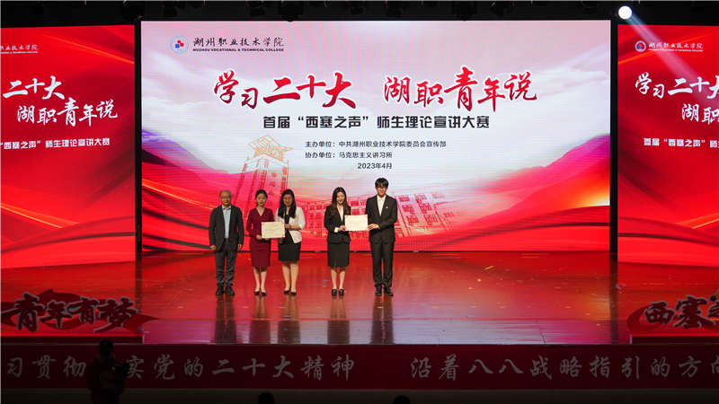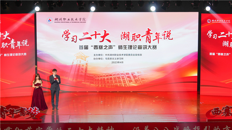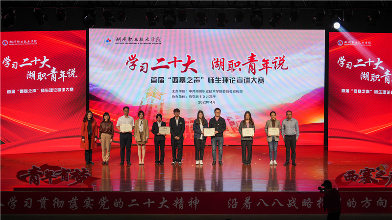 近日,由宣传部主办,马克思主义讲习所协办的“学习二十大,湖职青年说”首届师生理论宣讲大赛在学校艺体馆隆重举行,湖州市委宣传部理论党教处副处长林晖、湖州市委党校办公室主任、博士卢晨昊、湖州师范学院党委宣传部副部长程龙、湖州学院党委宣传部副部长谈铮渭、湖州职业技术学院马克思主义学院教授、博士苏醒等五位校内外专家担任大赛评委,校党委副书记叶主、校党委委员、组织部部长金祥、校党委委员、宣传部部长李晓英,学校各职能部门负责人及各党总支、直支班子成员出席大赛,11支来自各党总支、直支的青年师生队伍,以及各全日制二级学院学生代表1000余人参加大赛,一场别样的“大思政课”燃情上演。
