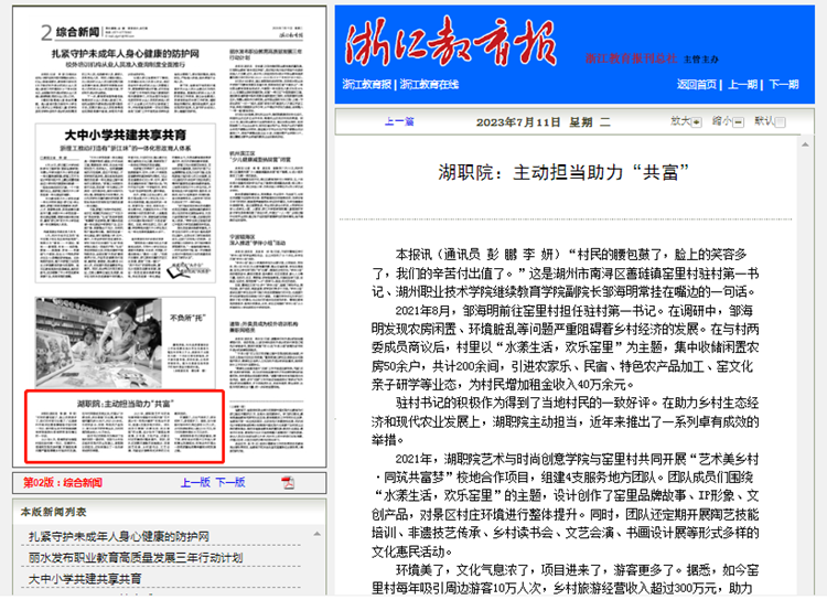 2023年7月11日《浙江教育报》对我校助力乡村振兴,校地合作打造共富之路进行了相关报道。