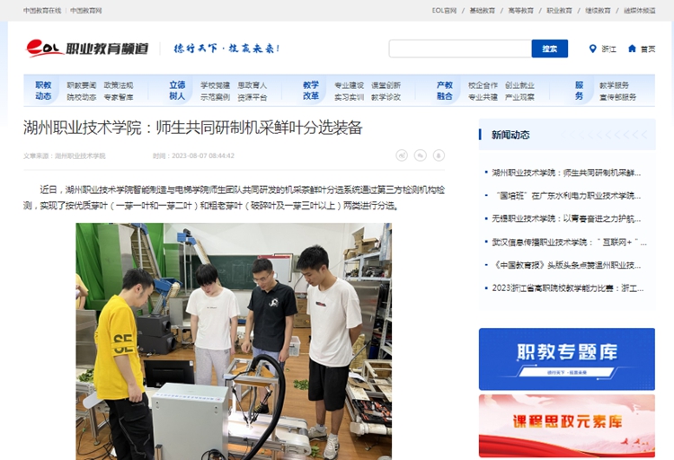 【中国教育在线】【学习强国】【eol校园】湖州职业技术学院:师生共同研制机采鲜叶分选装备