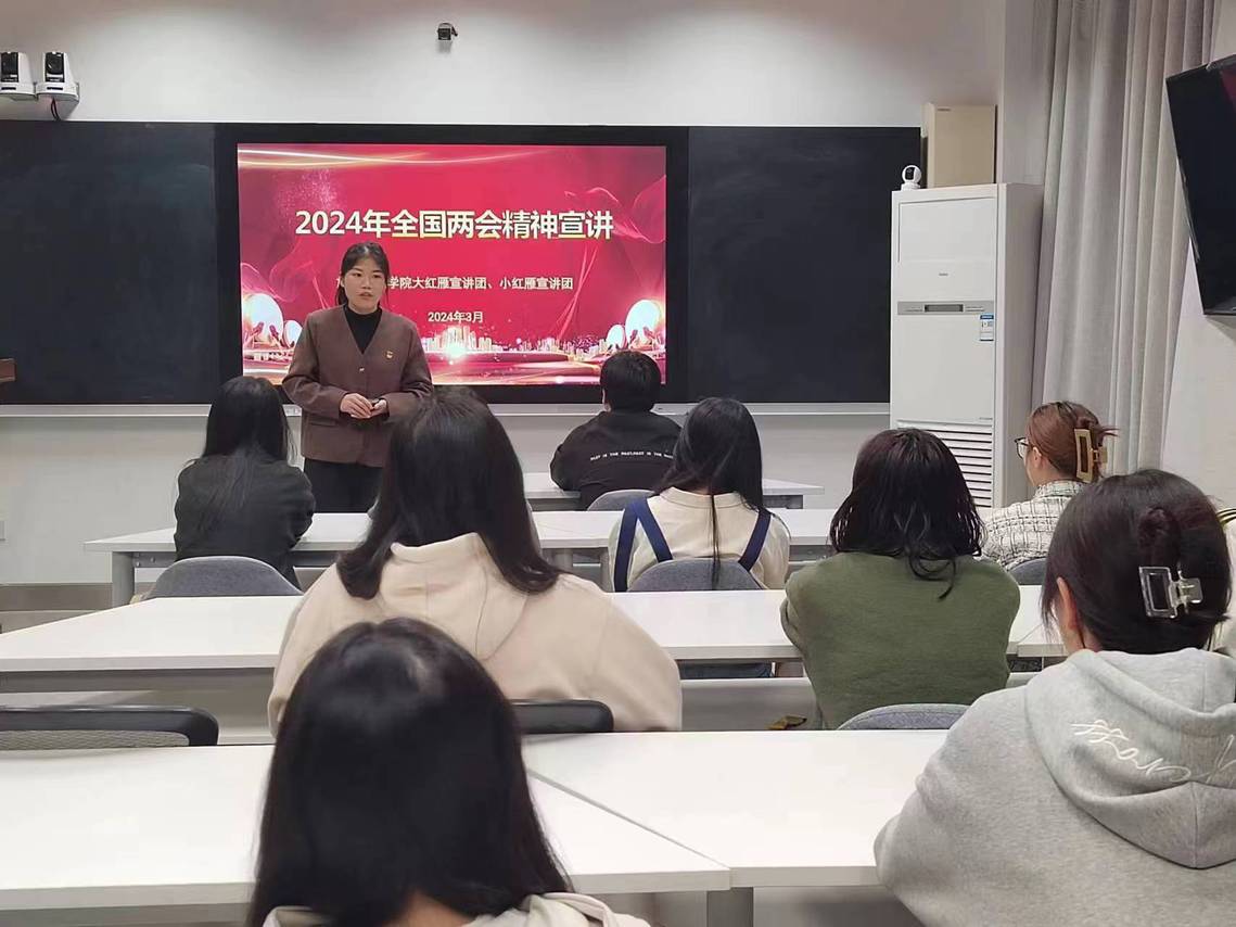 为深入学习贯彻习近平总书记在全国两会上的重要讲话精神、2024年全国两会精神,增强同学们的政治素养,3月24日晚,旅游管理学院大红雁宣讲团、小红雁宣讲团在6336教室开展全国两会精神宣讲主题教育活动,现场气氛热烈。