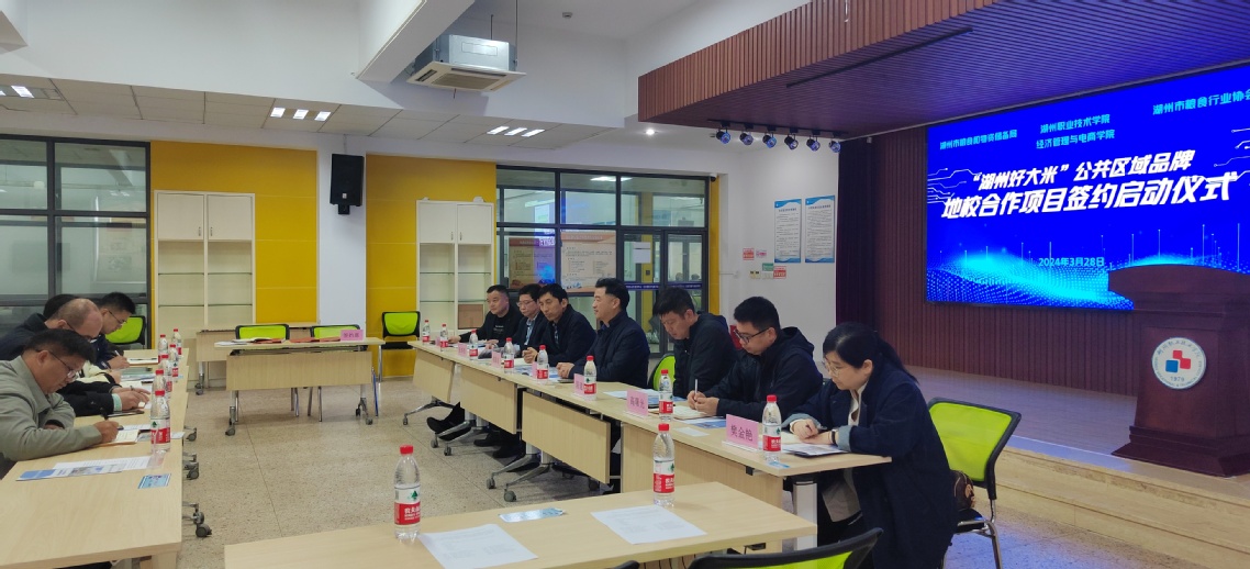 为深入推动地校协同合作,促进粮食行业电商技能人才的培养,拓宽学院学生实习就业的渠道,3月28日上午,经济管理与电商学院与湖州市粮食和物资储备局、湖州市粮食协会开展“湖州好大米”公共区域品牌地校合作项目签约仪式。湖州市粮食和物资储备局副局长王坚、湖州市粮食协会会长陈建华、南浔区粮食和物资储备局副局长高曙光、学院院长、党总支副书记、副院长、电商专业主任等出席签约仪式。