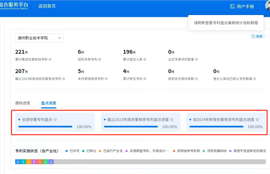 通过专利建档、盘点入库等环节,全面系统地梳理了我校的存量专利,学校成功构建了存量专利基础库,并进一步完善了专利转化资源库。这一成果必将为知识产权保护和高质量成果的转化、专利推广和产业化打下坚实基础。