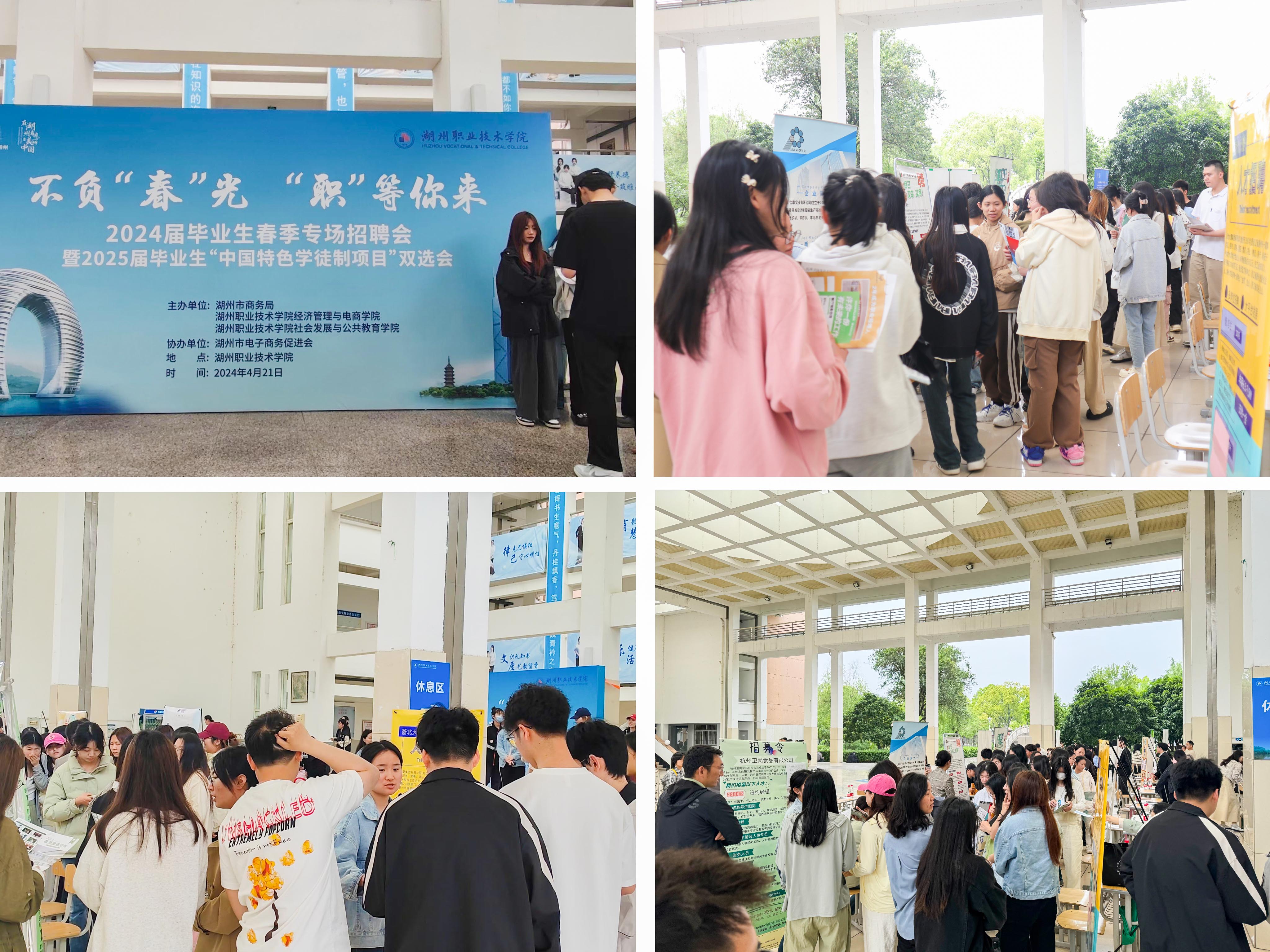 人间四月好春光,为进一步助力2024届毕业生把握“金三银四”求职关键期,实现更加充分和更高质量就业,同时推动2025届毕业生大力参与“中国特色学徒制项目”,为预就业做好充分准备,近期,我校经济管理与电商学院、社会发展与公共教育学院联合湖州市商务局、湖州市电子商务促进会等单位,政校行紧密合作“引企入校”举办“不负‘春’光,‘职’”等你来”2024届毕业生春季专场招聘会暨2025届毕业生“中国特色学徒制项目”双选会,共计有45家用人单位来到招聘会现场选贤纳才。