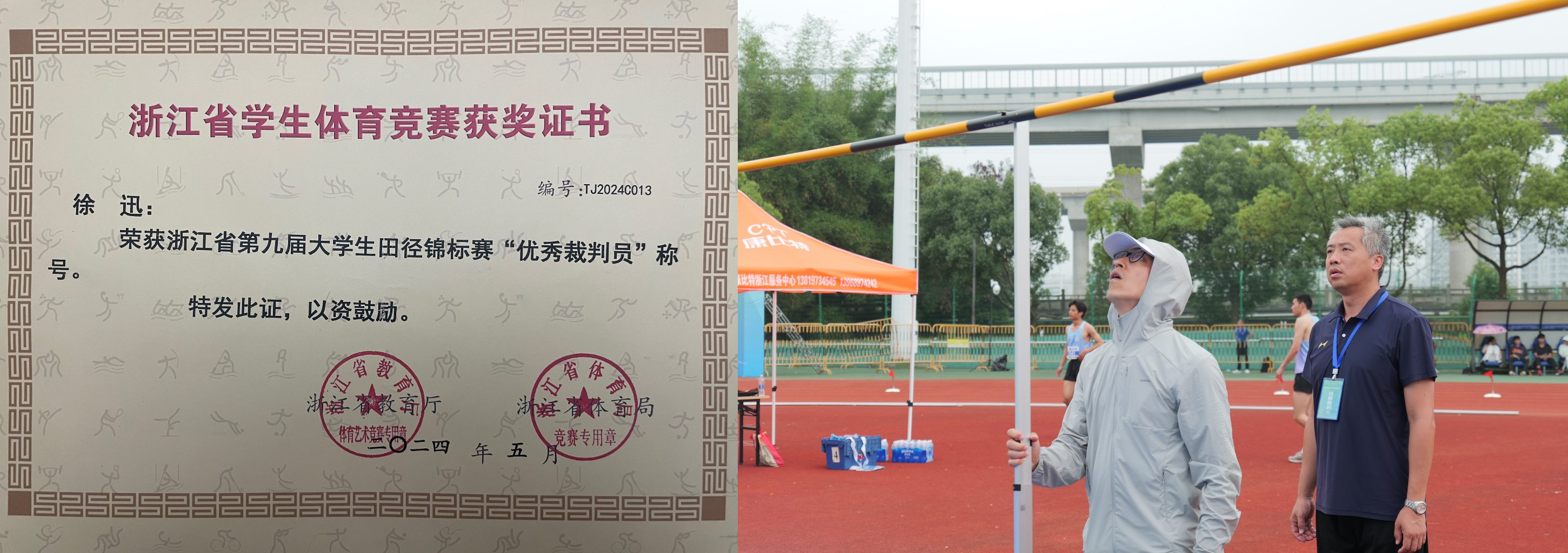 我校国家级田径裁判徐迅老师被浙江省学校体育协会选派担任田径比赛田赛裁判长,在为期四天八个单元的比赛中带领田赛A组执裁11场共164名运动员的跳高、撑杆跳高比赛。