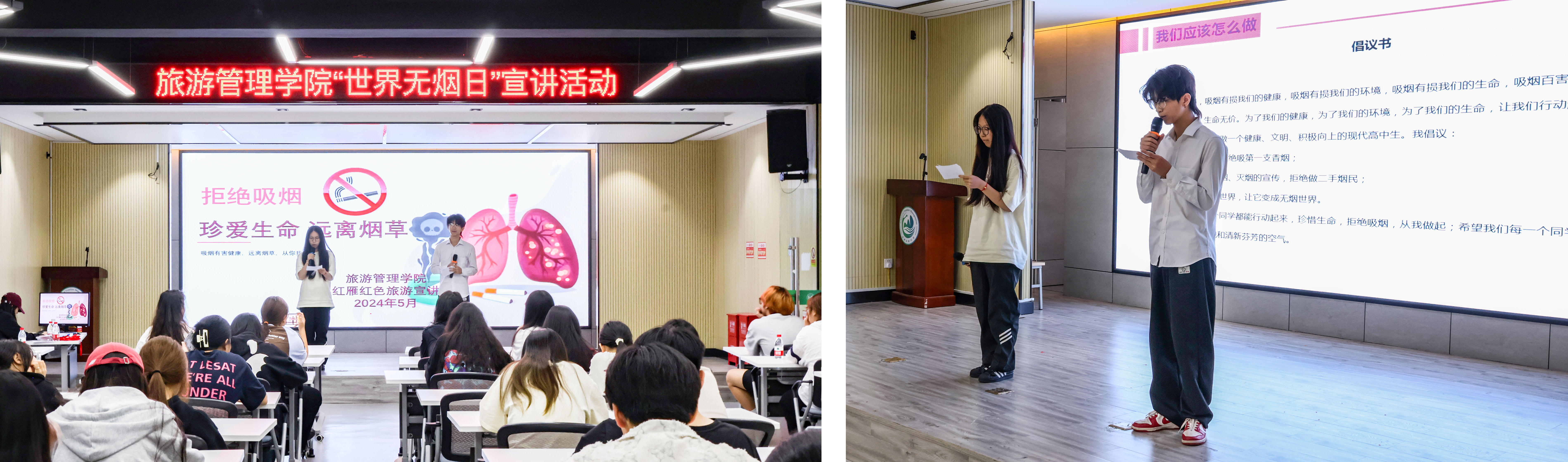 2024年5月31日是第37个世界无烟日,今年的主题是“保护青少年免受烟草危害”。5月30日晚,我校旅游管理学院“小红雁红色旅游宣讲团”在6330教室开展了“世界无烟日”宣讲活动,学院各专业学生代表参加。
