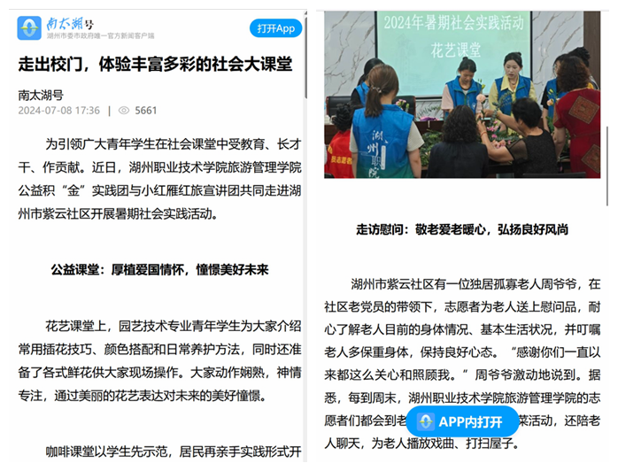 》报道了我校旅游管理学院公益积“金”实践团与小红雁红旅宣讲团在吴兴区紫云社区开展的暑期社会实践活动的相关新闻。
