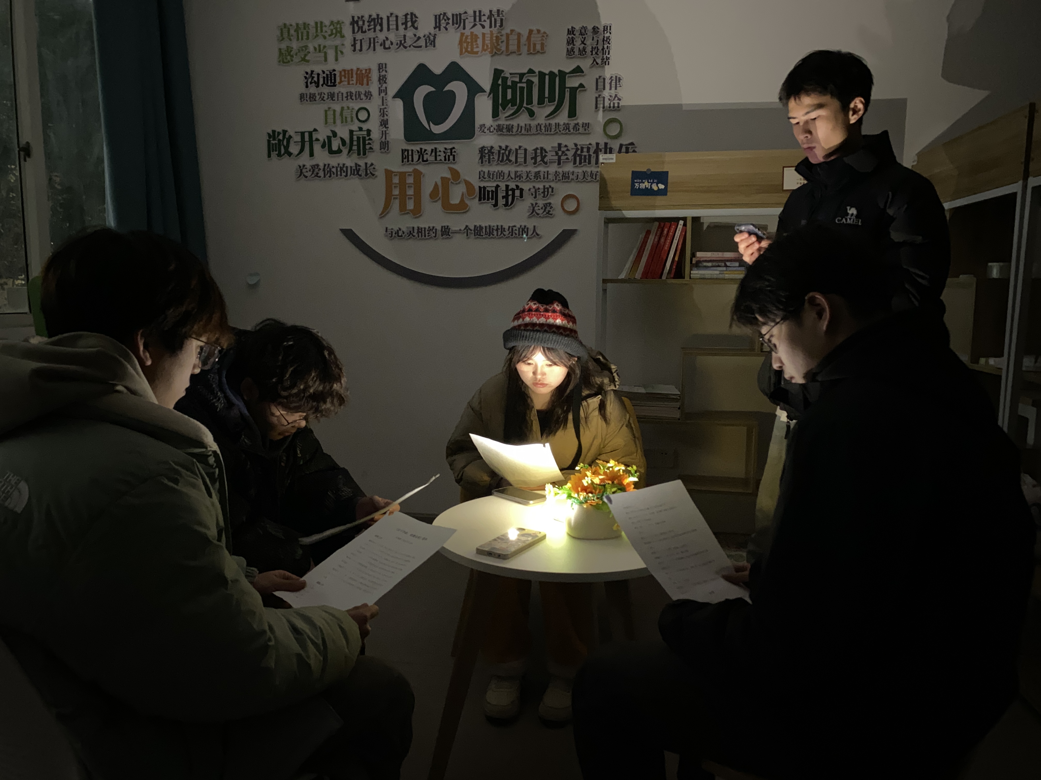 本次活动以剧本杀《心灵迷宫》为载体开展,这是一场关于生命与心灵的奇幻之旅。当同学们踏入精心布置的活动场地,神秘的氛围扑面而来,幽微的烛光摇曳,似在低语生命的无常。道具细节满满,仿佛具有魔力,将每一位参与者瞬间拉进剧本的世界。大家随机抽取角色,就此开启独特的心路历程。从那一刻起,他们不再仅仅是自己,而是化身为剧中角色,带着各自的心理包袱与隐秘动机,在复杂的人物关系网中穿梭。