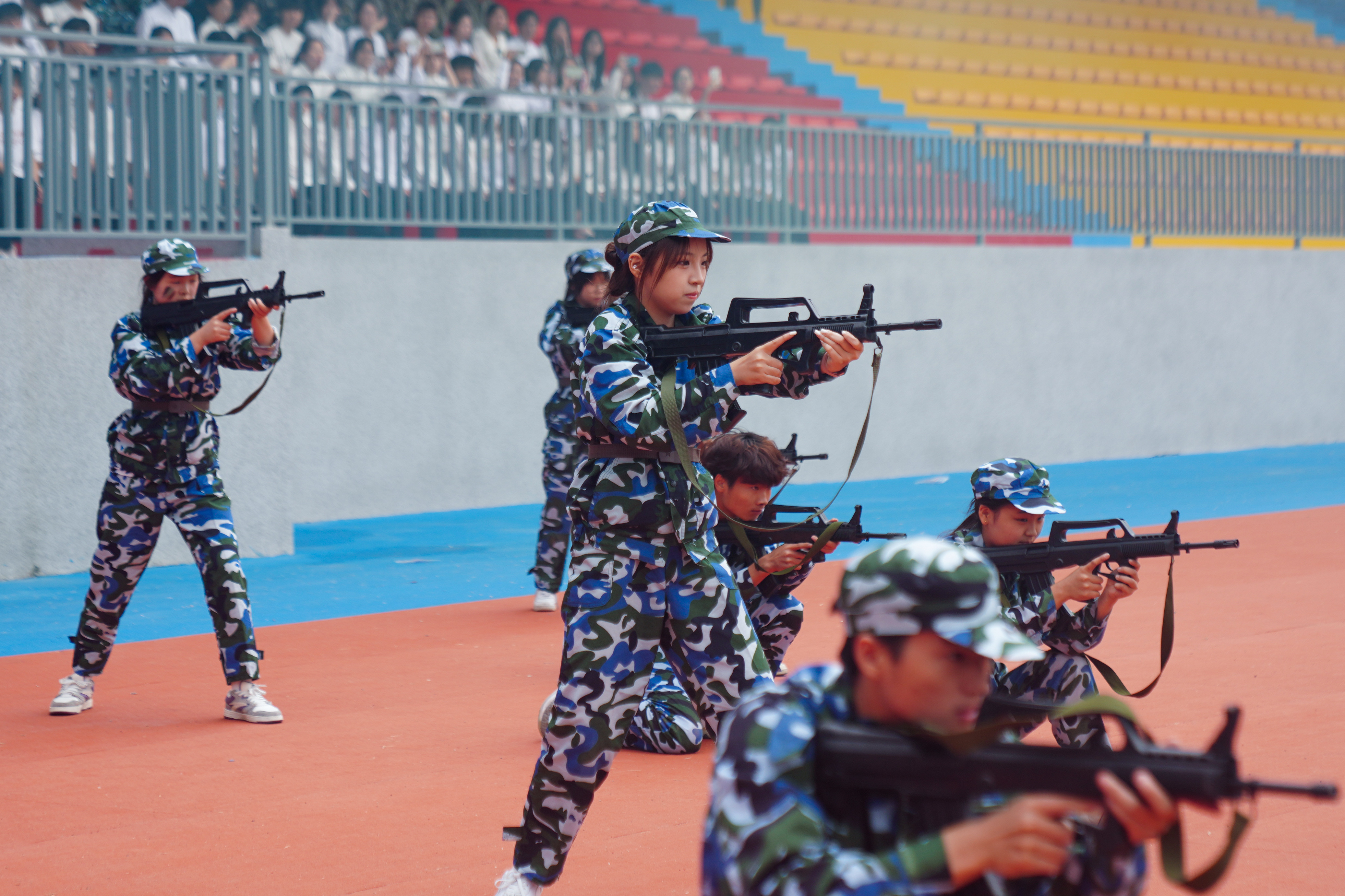 伴随着军乐曲的激昂旋律,2025级新生进行军训汇报展示。整齐的队列、嘹亮的口号、铿锵的步伐展现了新一届湖职学子良好的精神风貌。