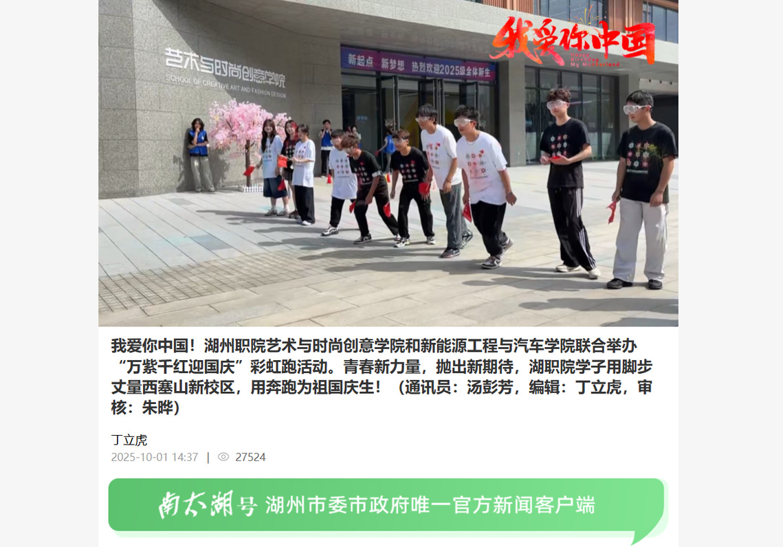 2025年10月1日《南太湖号》报道了我校艺术与时尚创意学院和新能源工程与汽车学院联合举办“万紫千红迎国庆”彩虹跑活动的相关新闻。