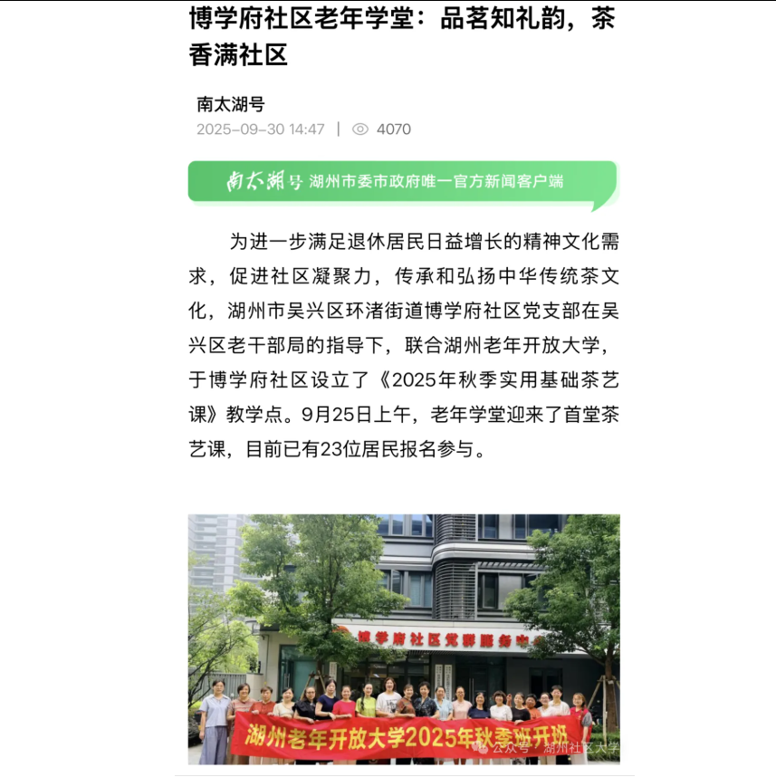 2025年10月10日《南太湖号》报道了我校湖州老年开放大学联合湖州市吴兴区环渚街道博学府社区于该教学点设立的《2025年秋季实用基础茶艺课》开班的相关新闻。
