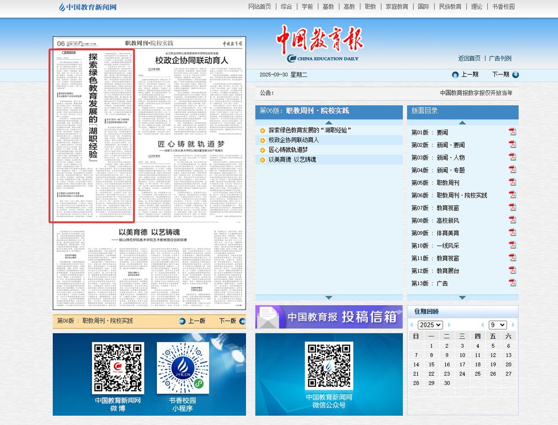 2025年9月30日《中国教育报》刊发了《探索绿色教育发展的“湖职经验”》一文。