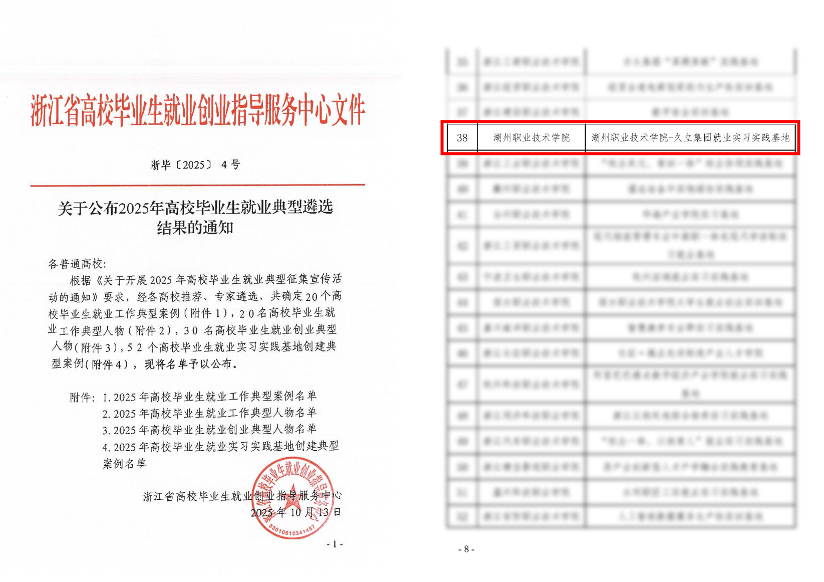 近日,浙江省高校毕业生就业创业指导服务中心公布了2025年高校毕业生就业典型遴选结果,我校智能制造与电梯学院《湖州职业技术学院——久立集团就业实习实践基地》案例入选高校毕业生就业实习实践基地创建典型案例。