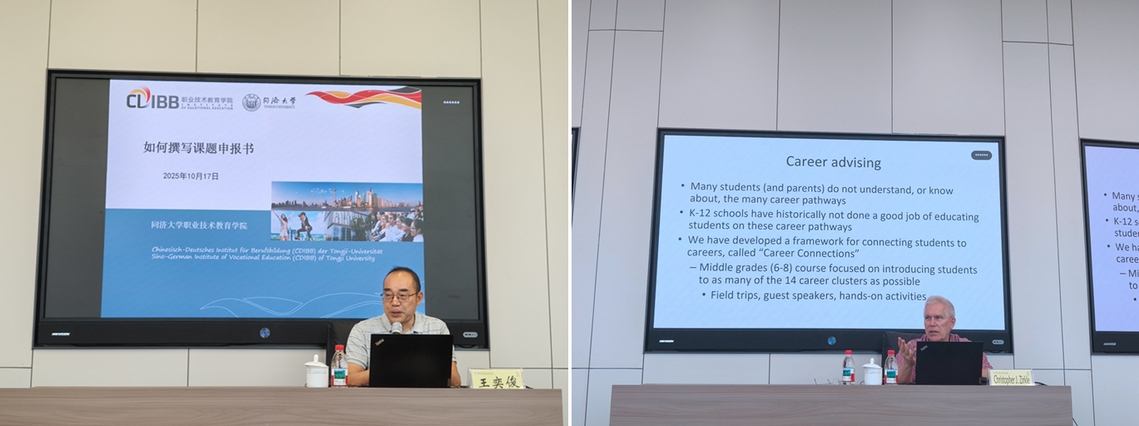 来校交流期间,王奕俊和Christopher L. Zirkle分别为青年教师做了“如何撰写课题申报书”和“美国职业教育学校如何开展产教融合、校企合作”专题报告,教师代表进行互动交流。