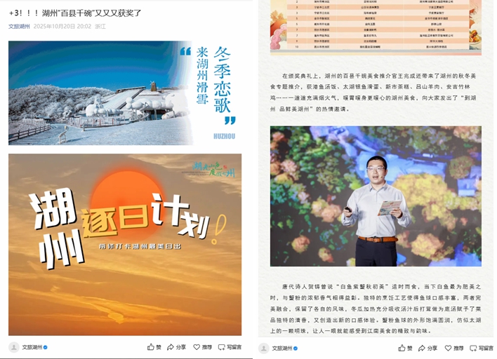 2025年10月20日《文旅湖州》报道了我校教师在2025年全省“味美浙江·百县千碗”创新菜品挑战赛颁奖典礼上推介湖州美食的相关新闻。
