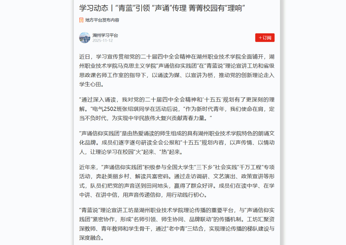 2025年11月12日《学习强国》报道学校马克思主义学院“声诵信仰实践团”开展党的创新理论宣讲的相关新闻。