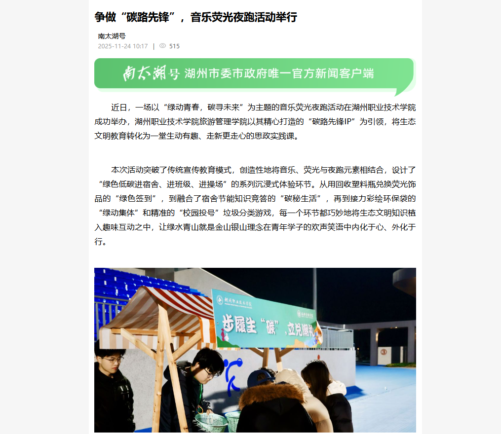 2025年11月24日《南太湖号》报道学校旅游管理学院开展音乐荧光夜跑活动的相关新闻。