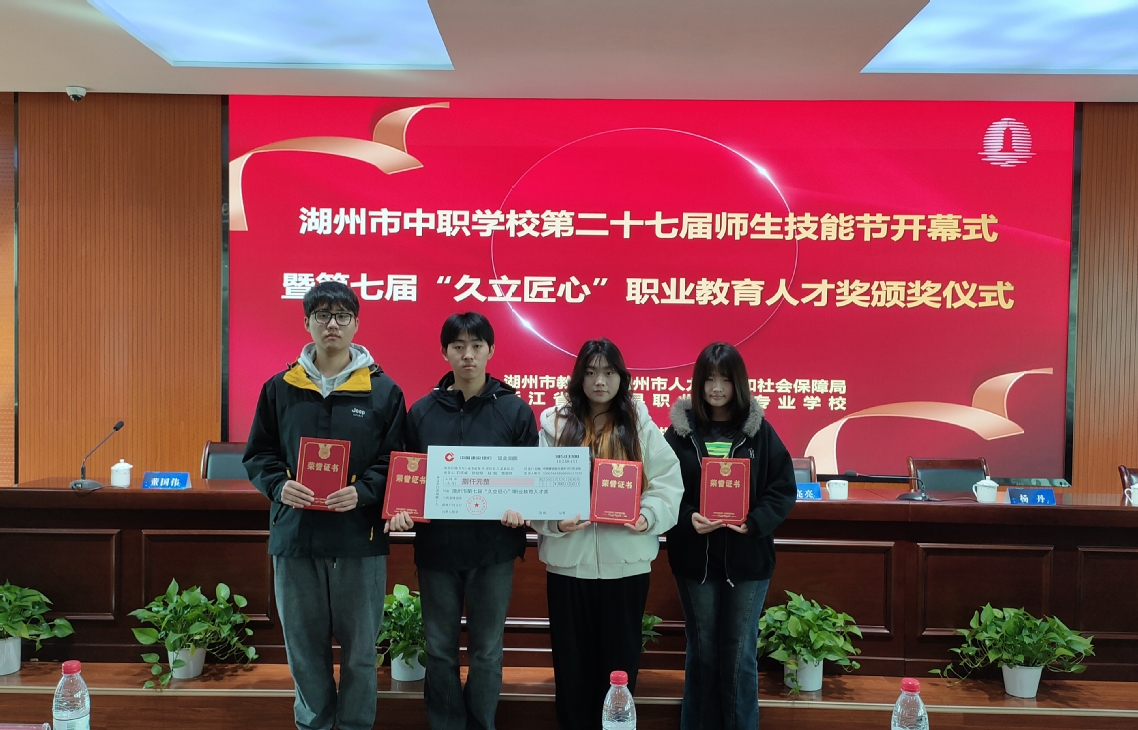 11月25日,湖州市中职学校第二十七届学生技能节开幕式暨第七届“久立匠心”职业教育人才奖颁奖仪式,在德清县职业中等专业学校成功举办,我校石权威、孙培桀、孙悦、雪恩琦四位同学和两位指导教师荣获“久立匠心”职业教育人才奖。