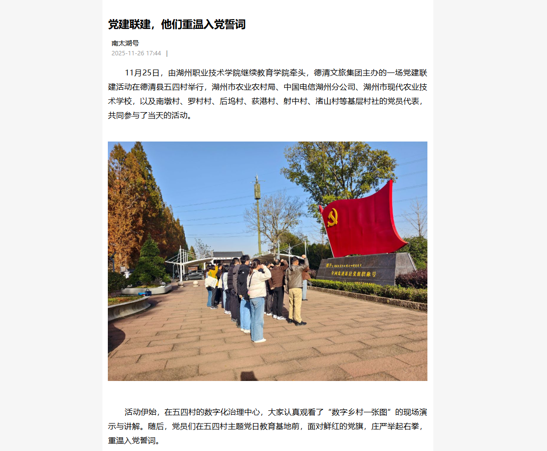 2025年11月26日《南太湖号》报道学校继续教育学院牵头,德清文旅集团主办的一场党建联建活动在德清县五四村举行的相关新闻。