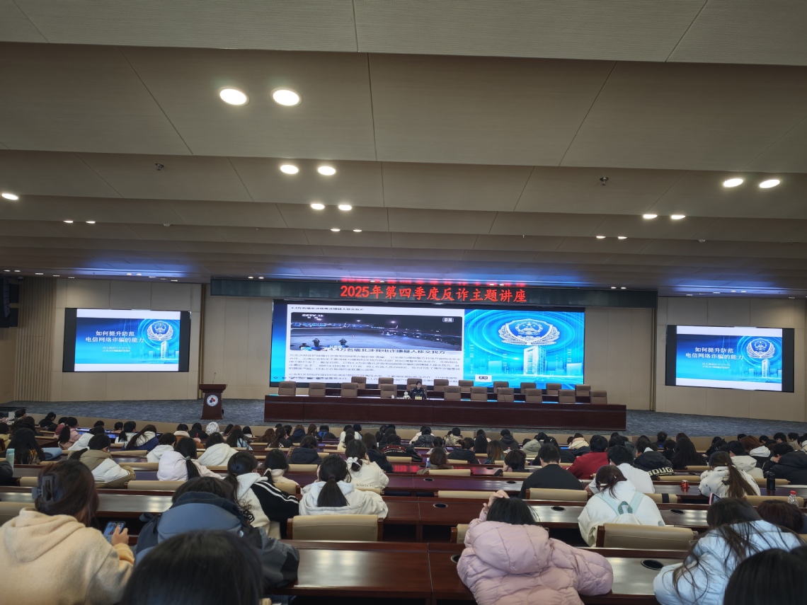 为持续深化校园反诈防诈工作,精准应对新形态的电信诈骗案件,切实提升学生风险防范意识与识骗防骗能力,11月27日中午,学校联合南太湖新区公安分局反诈中心,在5号楼辅楼301报告厅举办反诈主题讲座。240余名学生代表、辅导员及安全保卫部工作人员到场参与,共同学习反诈知识,提升防骗能力。