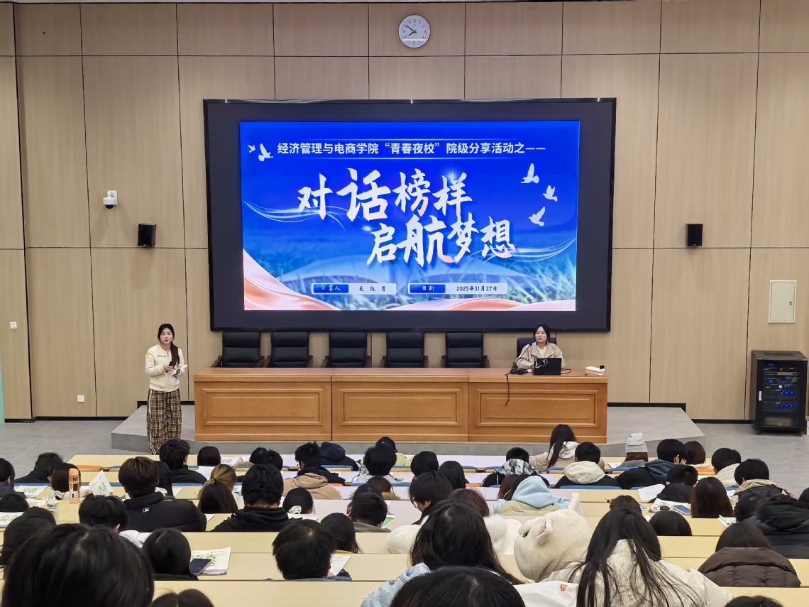 为引导青年学子树立榜样意识、明确大学奋斗方向,11月27日,经济管理与电商学院举办“对话榜样、启航梦想”主题讲座。本次活动邀请国贸2301班优秀学生代表毛凯男同学担任主讲人,全院190名大一新生参与了这场内容扎实、贴近实际的成长经验分享。